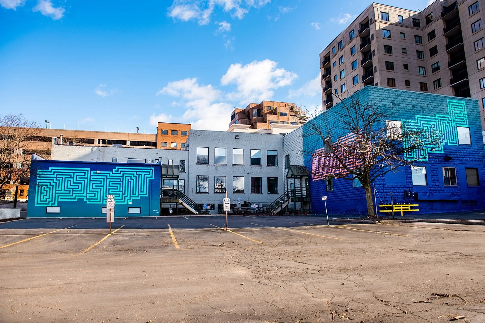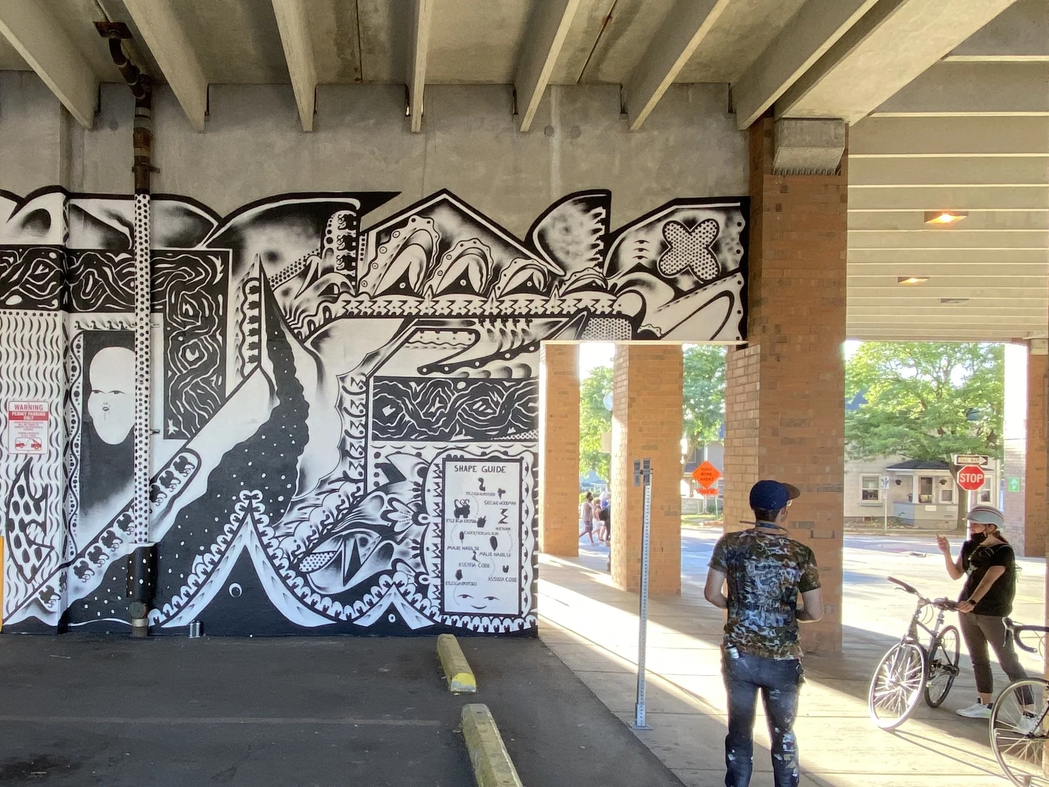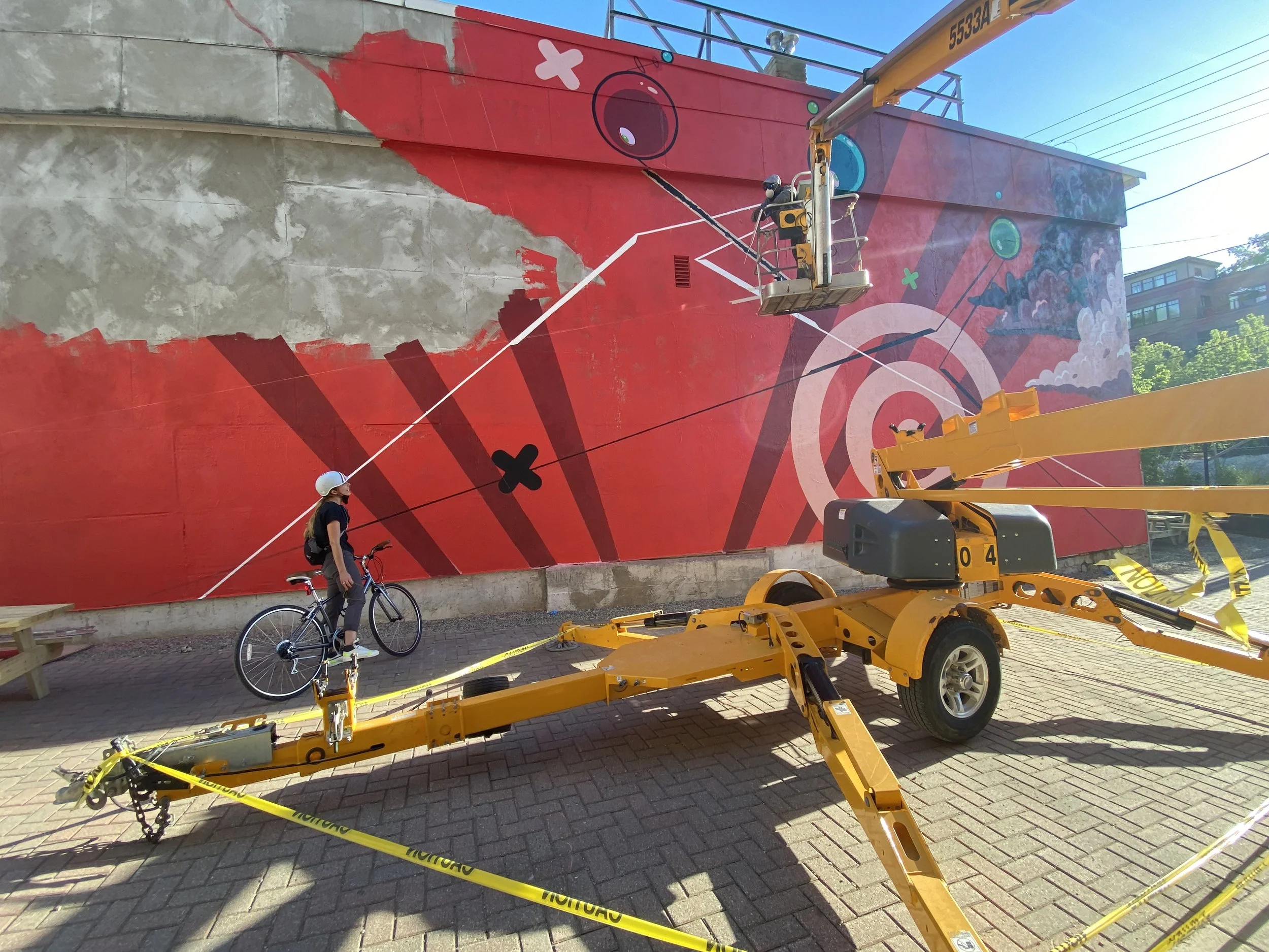 W.C. Bevan paints high-contrast visual movement, imaginary extensions of architecture, uncommon rhythms rooted in his mural at the 220 N Ashley St. Parking Structure.