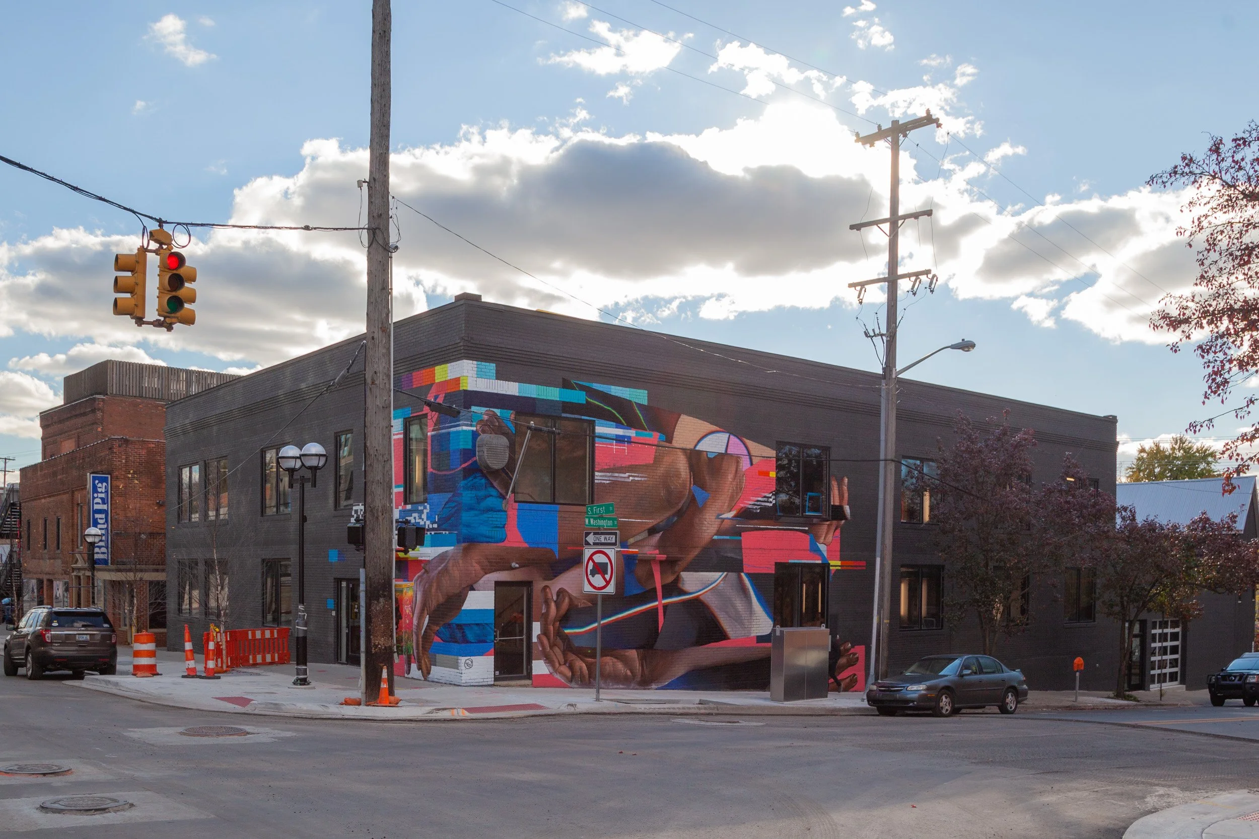 Located at the corner of Washington St. and First St., the mural considers the relationship between humanity and technology as we move into a future where these elements are inherently interwoven.