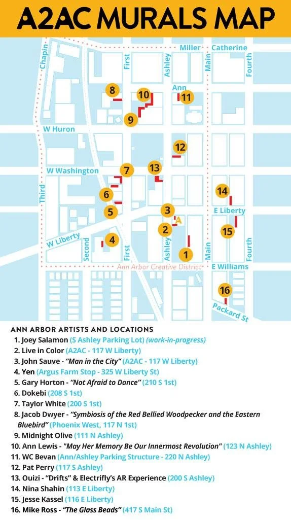 A2AC Murals is the culmination of pairing downtown building and business owners with local, regional, and national artists who transformed the building walls into spectacular expressions of their skill—providing the community and visitors the opportunity to experience and enjoy these large, vibrant works of public art. Synecdoche Design partnered with the Ann Arbor Art Center and provided an analysis on the potential development of the initiative.