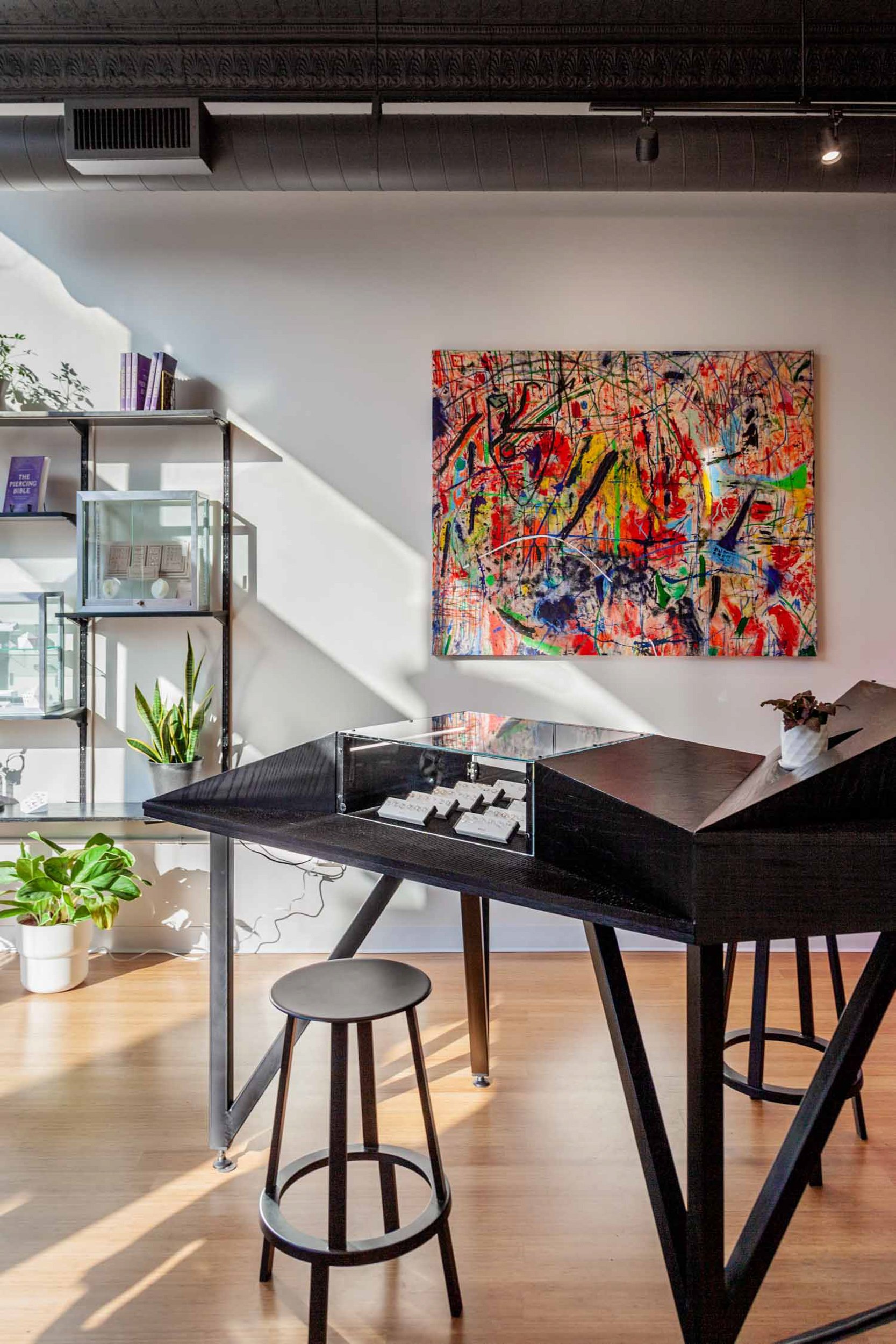 A pair of bespoke display and reception pieces – designed and crafted Synecdoche – ground the retail area, allowing guests to move freely to peruse jewelry, bucking the more formal hierarchy and sales bias of the traditional jewelry counter.