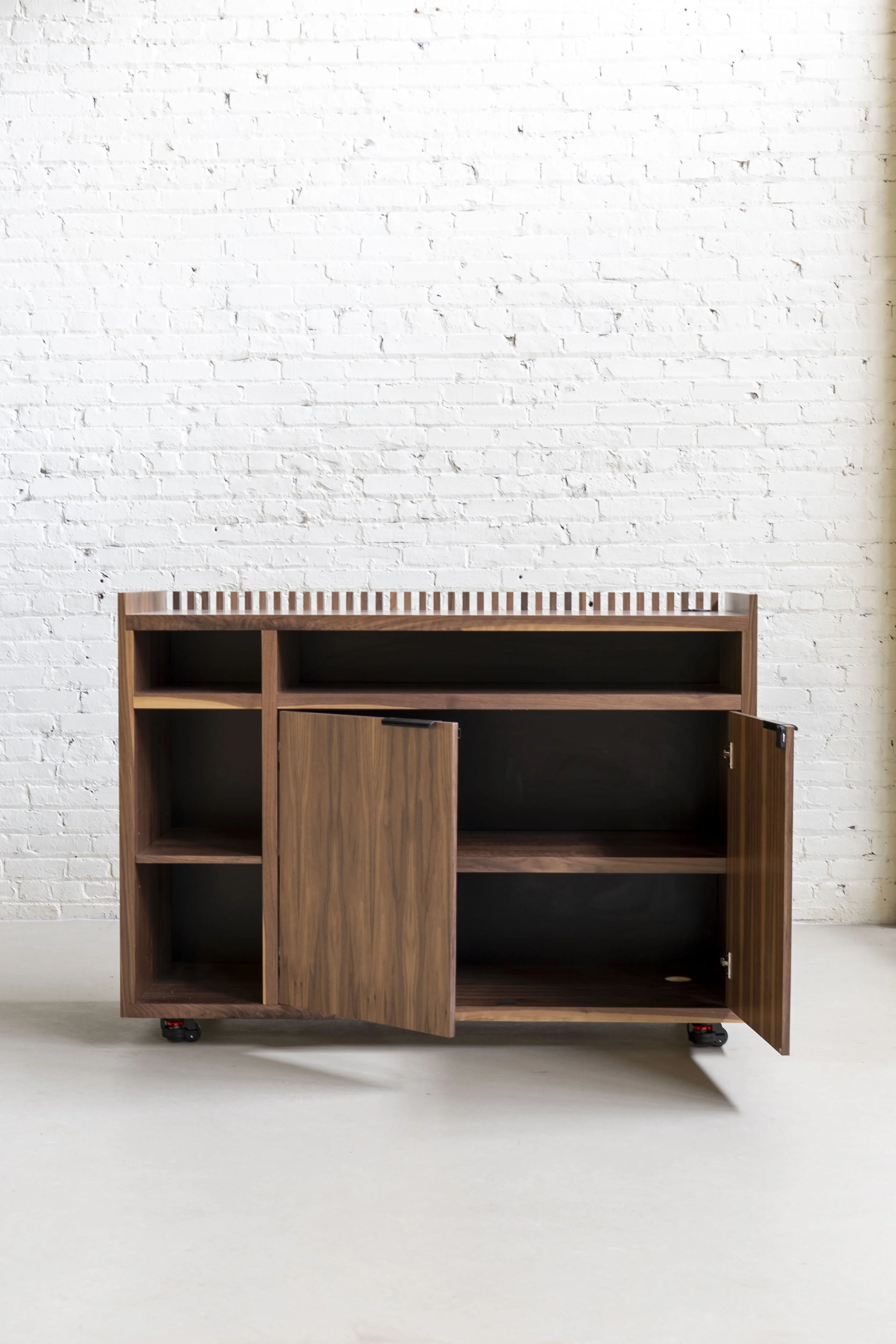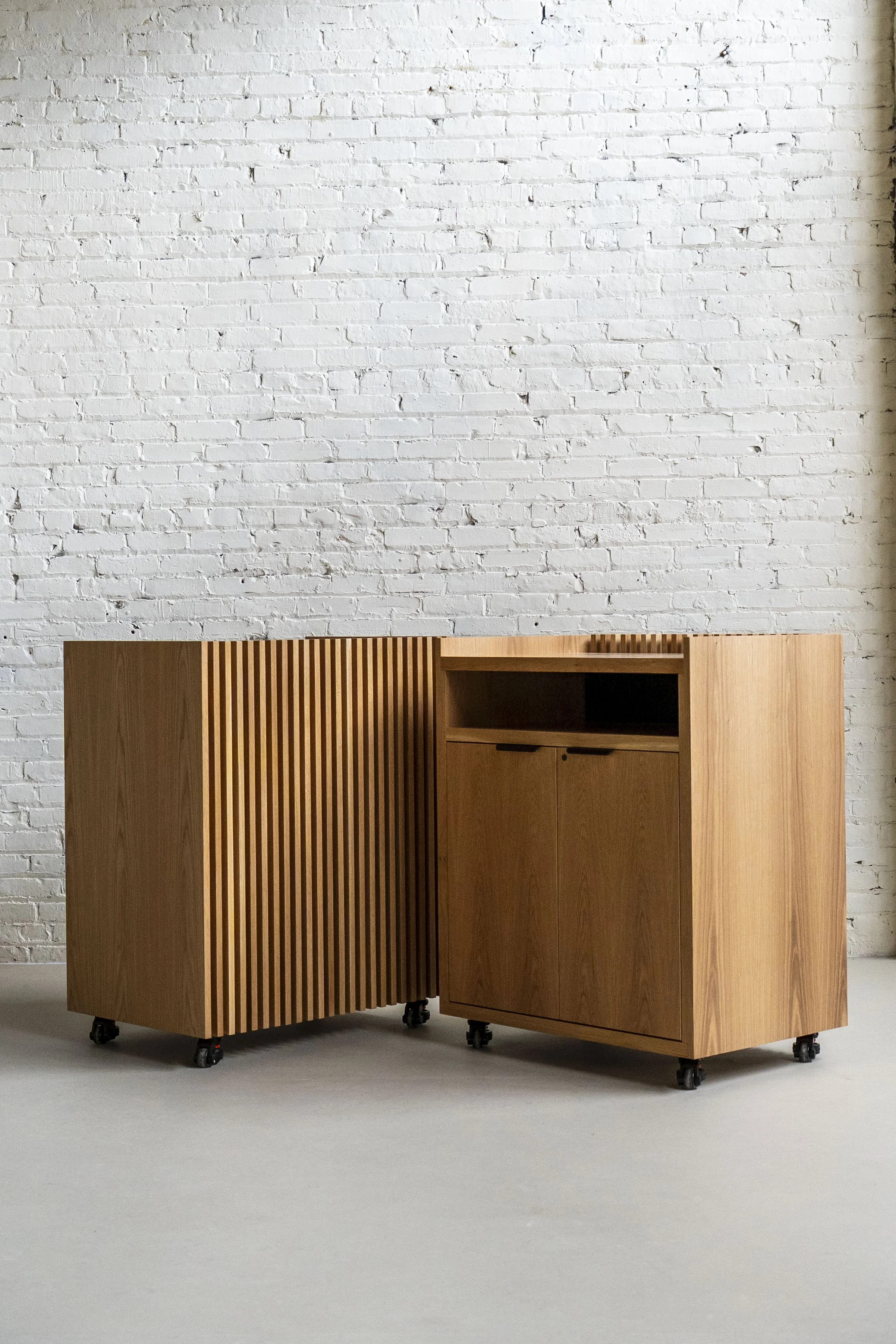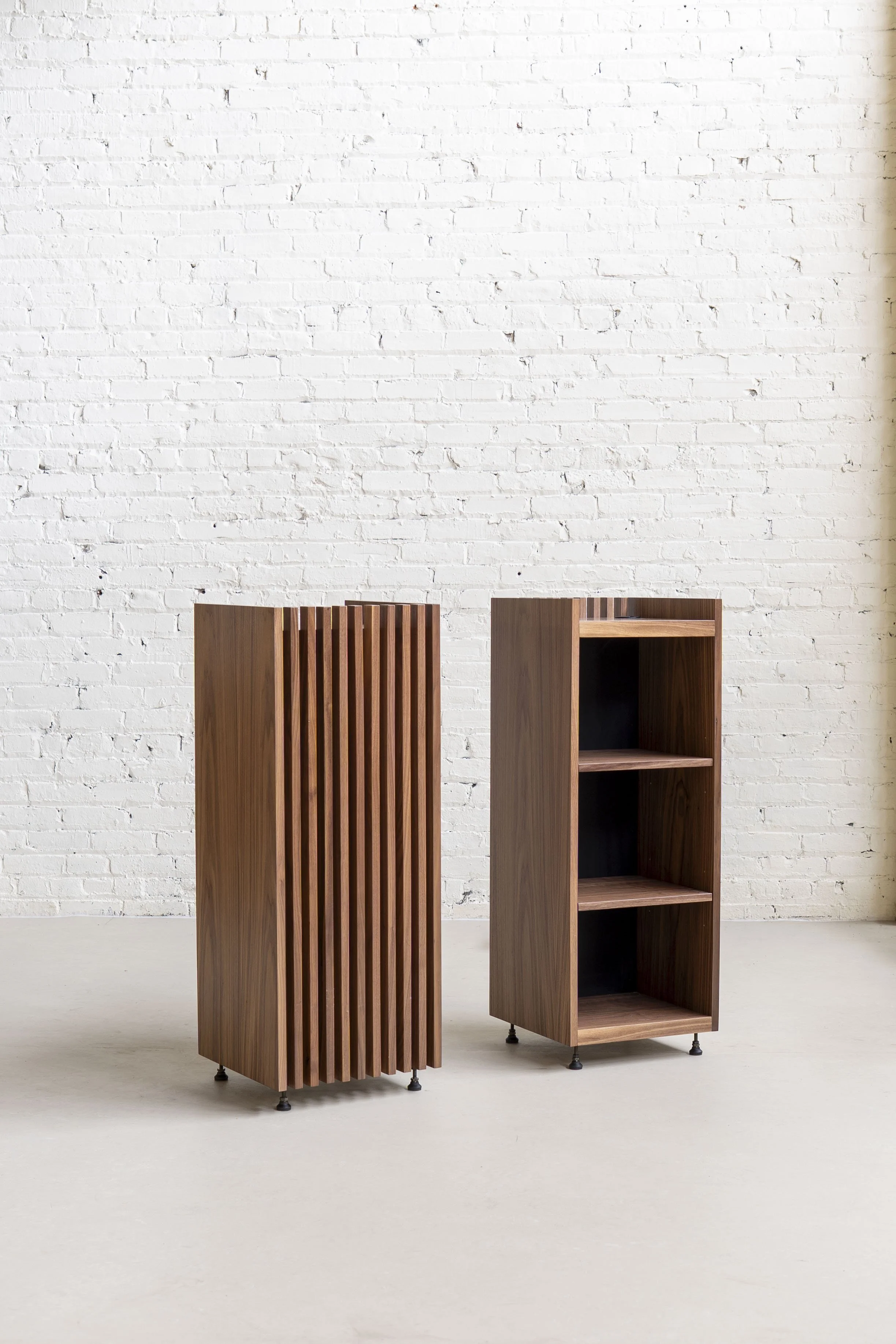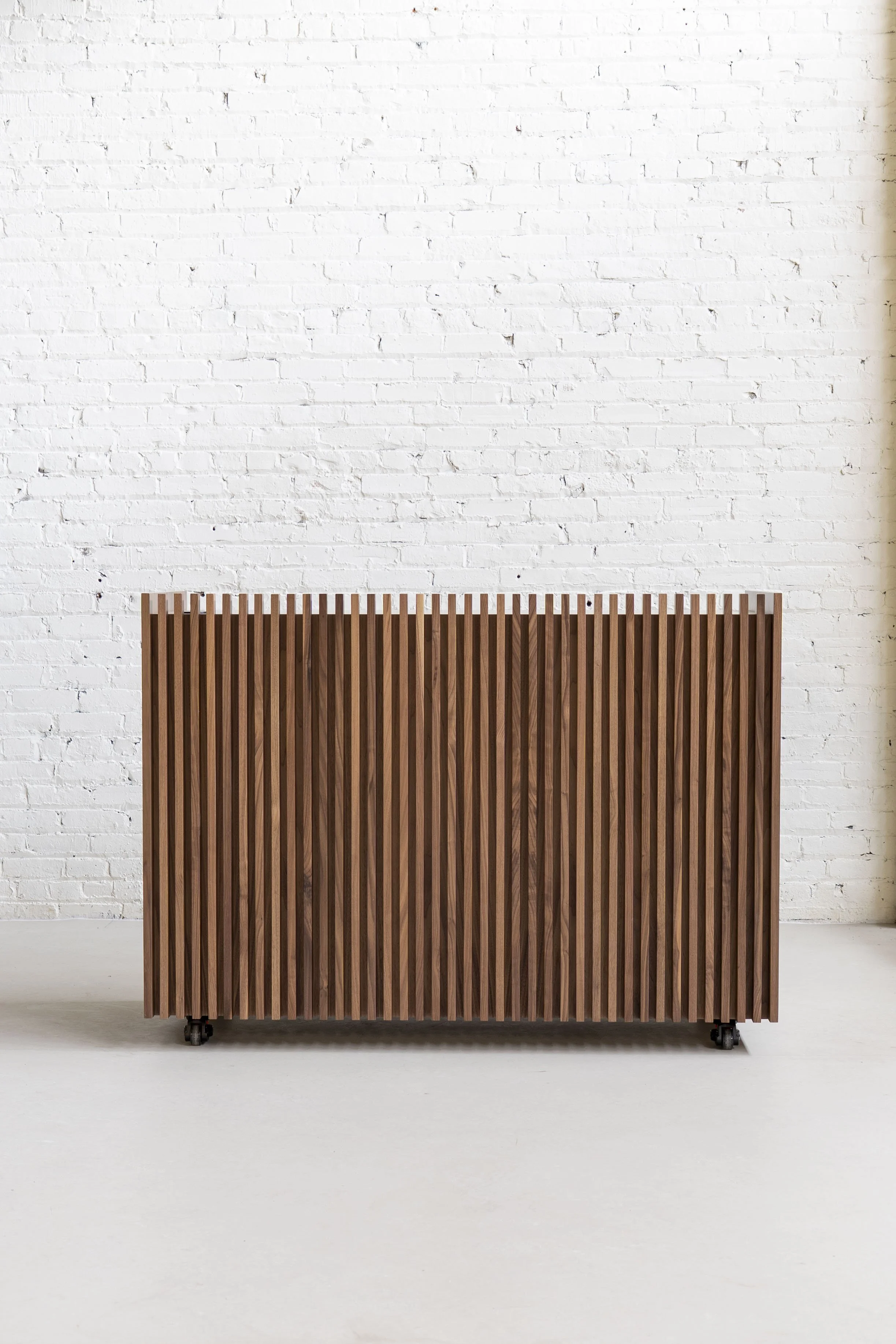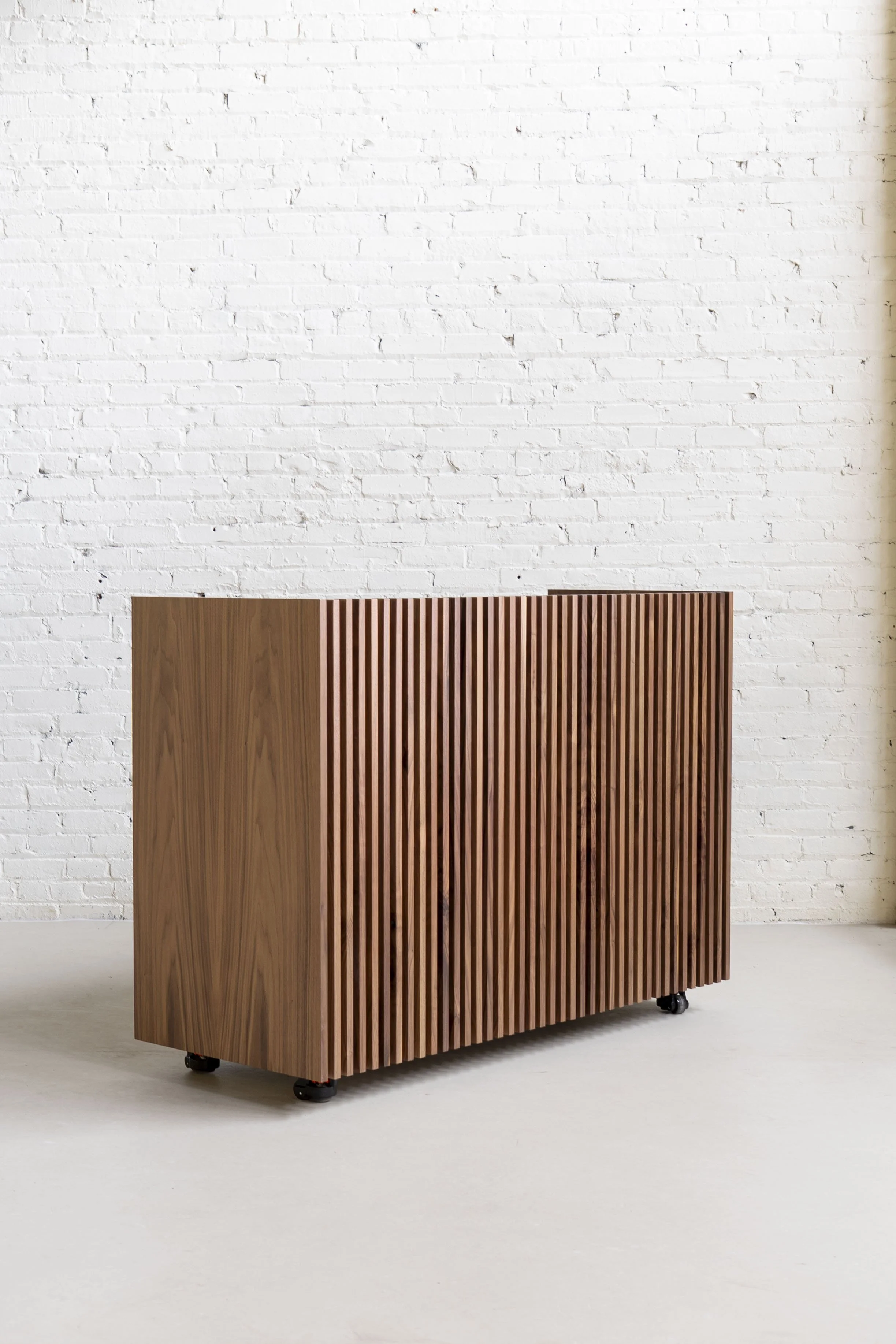 The Hatch Stand, a rich walnut slatted podium, comes in three sizes based on uses typical to hospitality such as restaurant host stand, valet stand, and concierge desk.