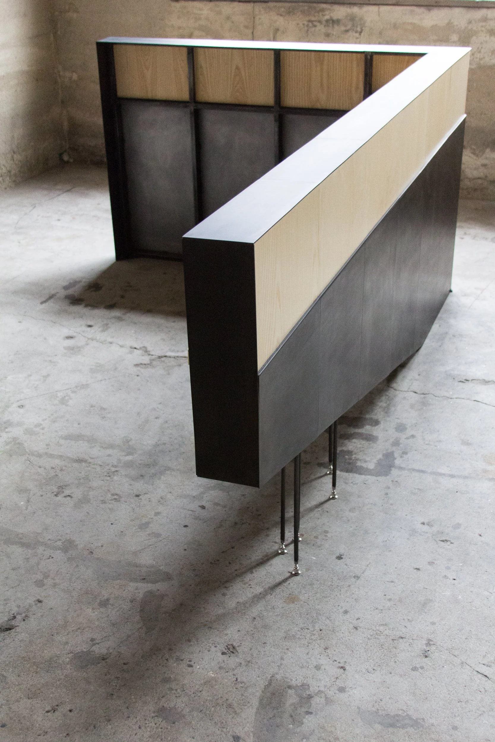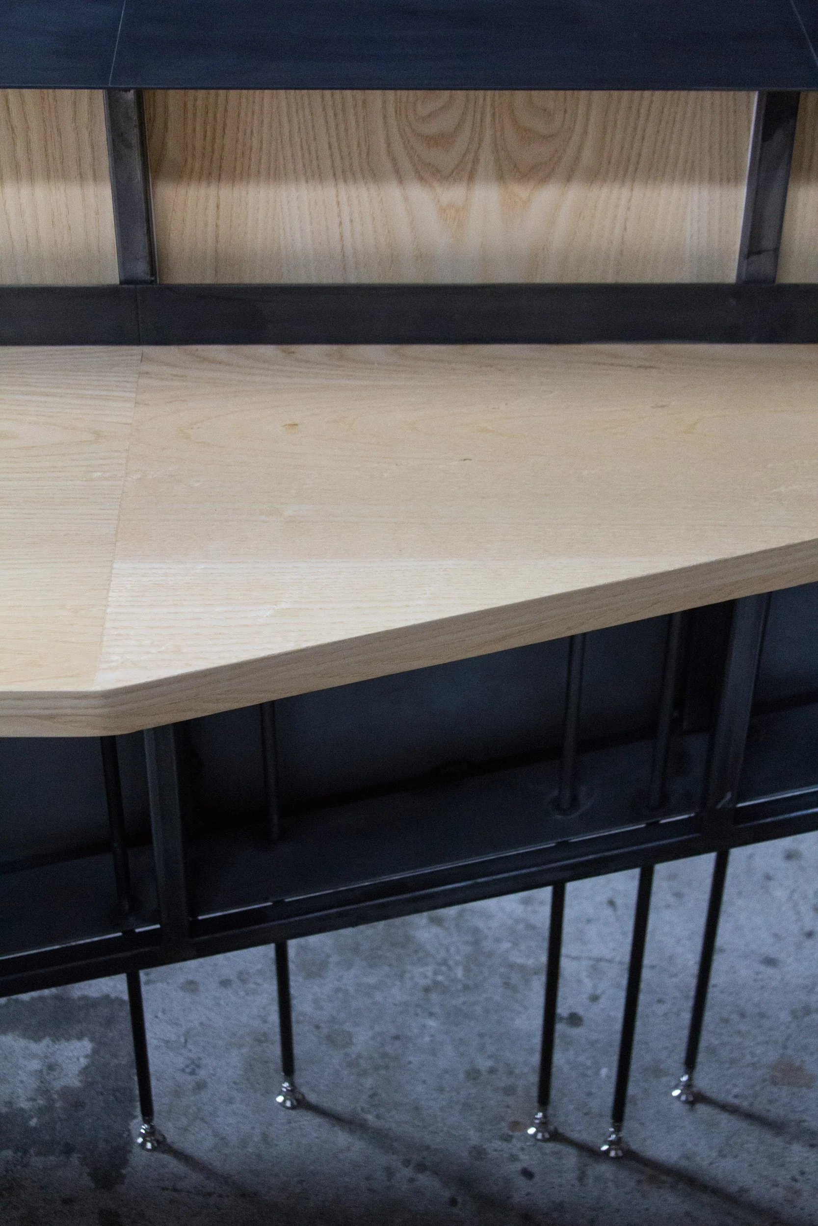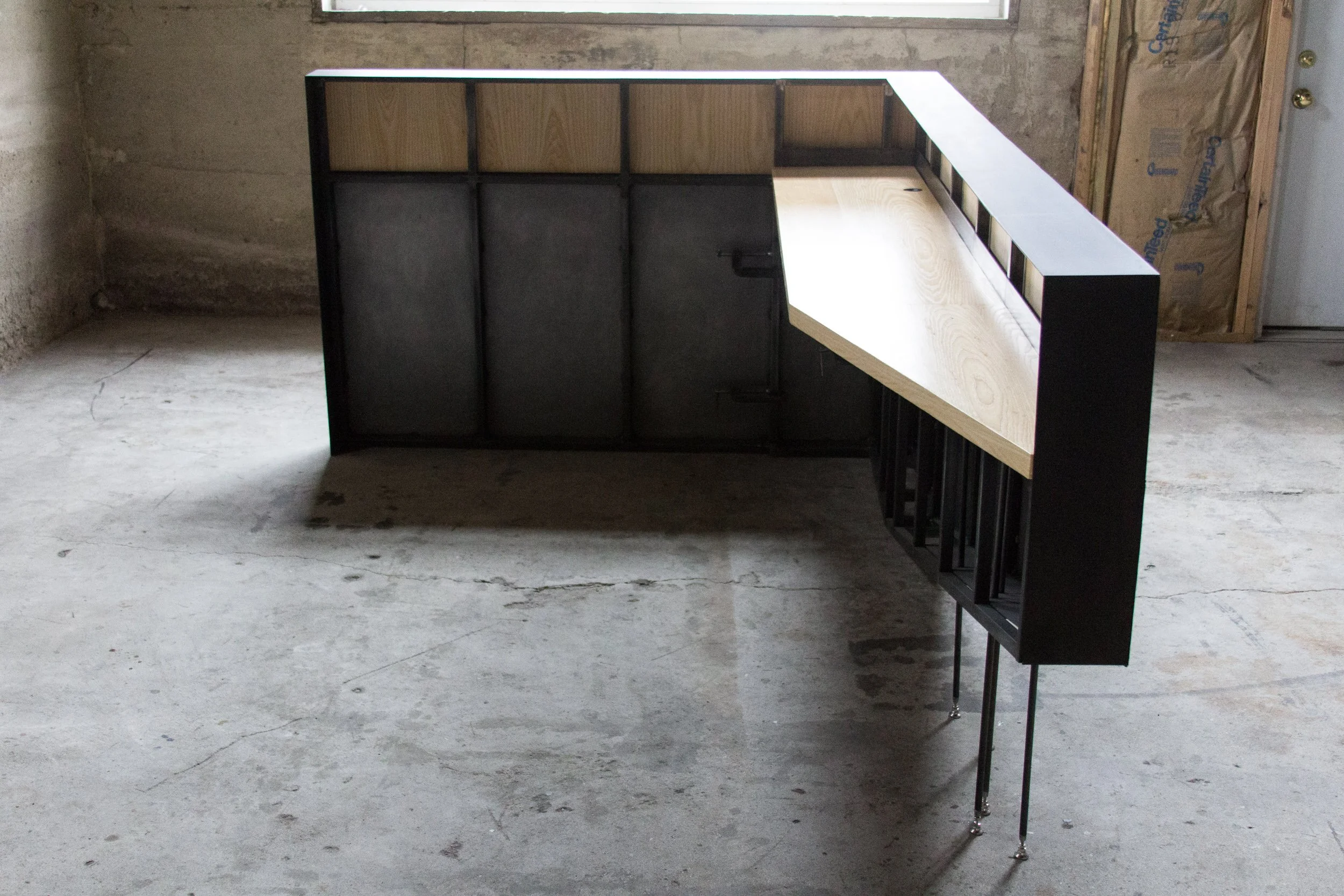 Constructed in an āLā shape, the desk features a retractable shelf and work space for employees. With light wood accents and a black slate frame, the reception desk has style and function