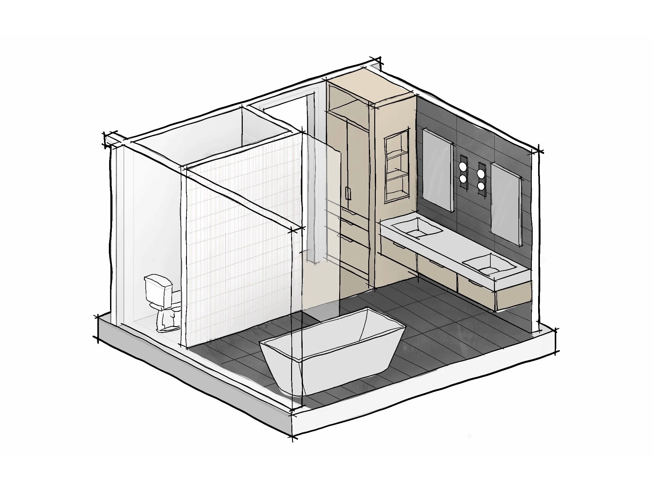 A tranquil reading nook anchors the East wing and becomes a sanctuary for the clients' extensive book collection. The bedroom suite, positioned to the north, provides vistas of the treeline and boasts an expansive steam shower, large enough for relaxation, alongside a luxurious soaking tub.