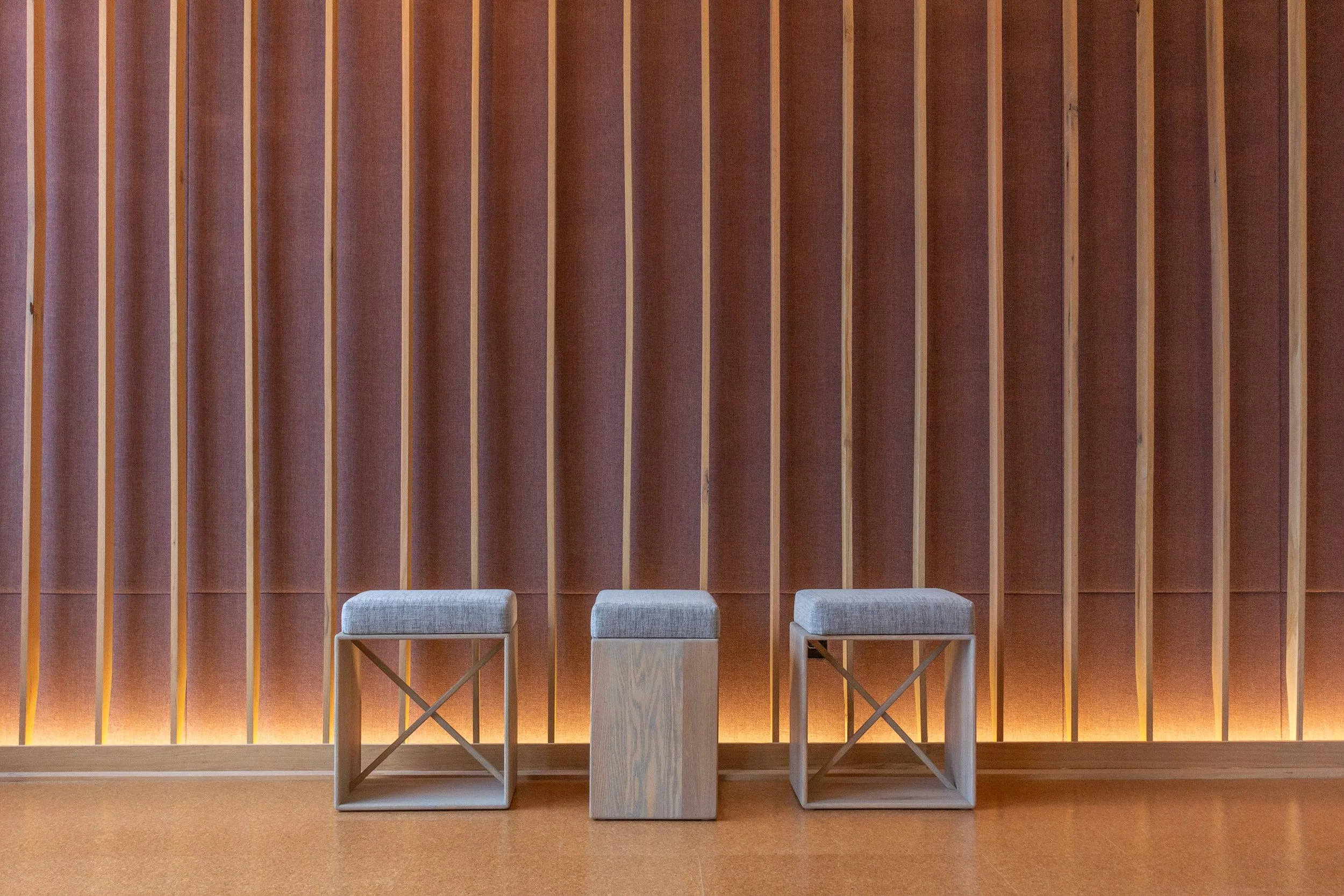 Natural materials including the locally harvested wood from the family forest compliment the warm tones and sophisticated details including elements with playful twists are found throughout the space for guests to discover as variations on design moments.