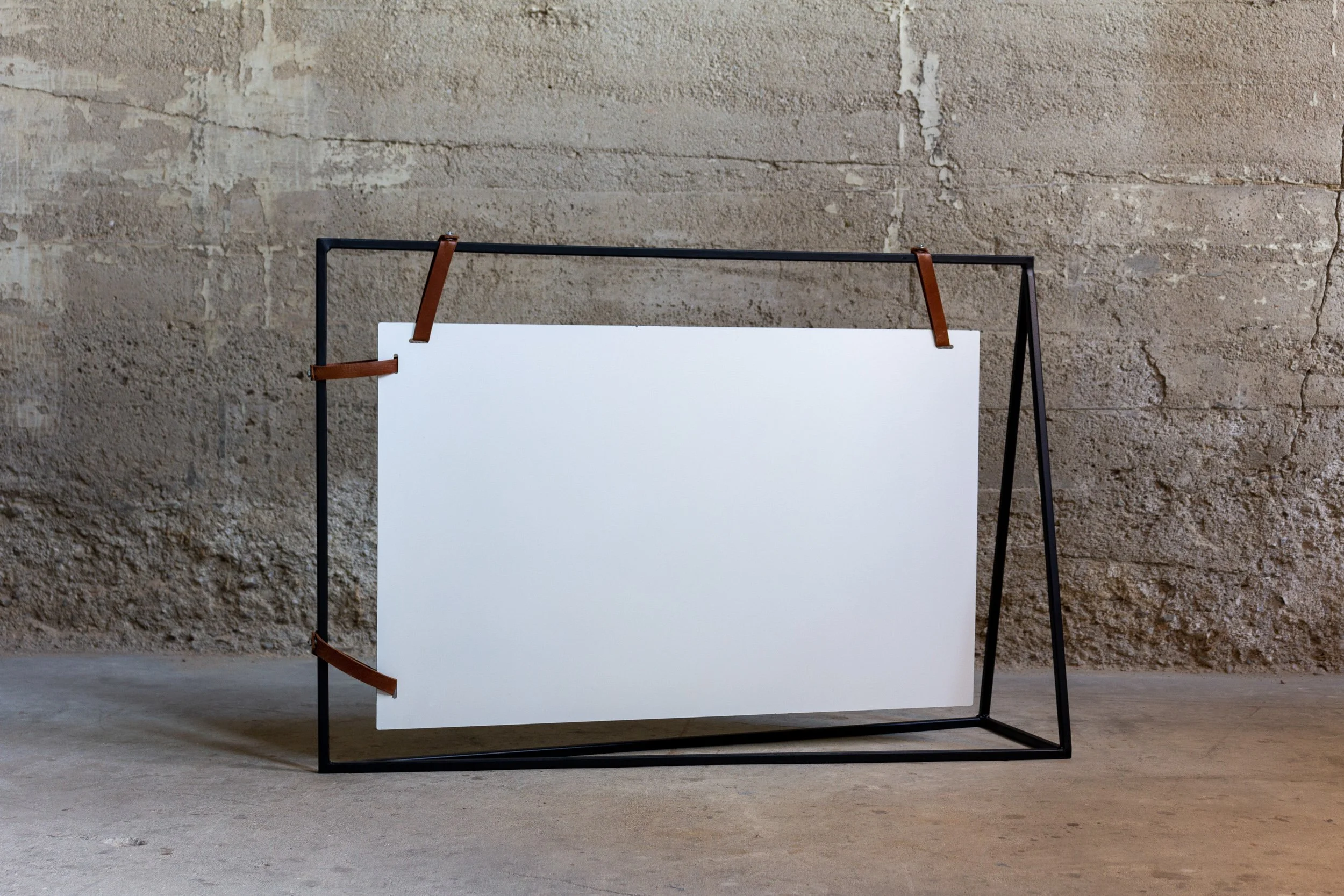 Available for purchase on the Synecdoche Shop, the sidewalk board is fabricated with a steel frame and leather straps to suspend a powder coated steel sign for magnetic attachments or vinyl decals.