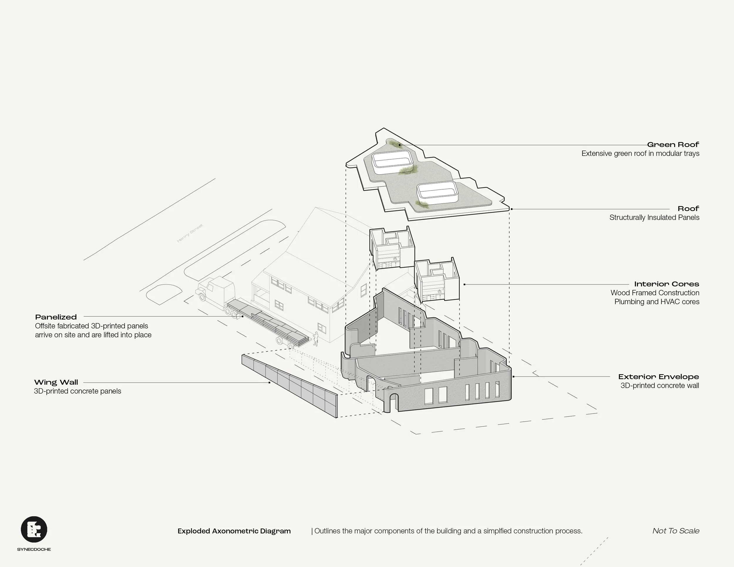 Pushing the boundaries of site and program, The Outlot’s proposed construction considers sustainability and form in its aim to increase the number of units on the site using an affordable construction method. Collaborating Citizen Robotics, insulated 3D-Printed concrete panels, which are fabricated off-site, form the envelope while the roof is constructed with Structural Insulated Panels (SIP).